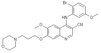 The alkylation of 4-hydroxy-3-methoxybenzoic acid methyl ester (I) with 3-(4-morpholinyl)propyl chloride (II) and tetrabutylammonium chloride in refluxing butanone gives 3-methoxy-4-[3-(4-morpholinyl)propoxy]benzoic acid methyl ester (III), which is nitrated with HNO3 in hot acetic acid to yield 5-methoxy-4-[3-(4-morpholinyl)propoxy]-2-nitrobenzoic acid methyl ester (IV). The reduction of (III) with H2 over Pd/C in methanol/ethyl acetate to afford the corresponding 2-amino ester (V), which is condensed with dimethylformamide dimethylacetal (VI) by heating at 100 C to provide the 2-(dimethylaminomethyleneamino) derivative (VII). The cyclization of (VII) with acetonitrile (VIII) by means of BuLi and CO2 in THF gives 6-methoxy-7-[3-(4-morpholinyl)propoxy]-4-oxo-1,4-dihydroquinoline-3-carbonitrile (IX), which is treated with refluxing SOCl2 to yield the 4-chloroquinoline derivative (X). Finally, this compound is condensed with 2-bromo-5-methoxyaniline by means of pyridine hydrochloride in 2-ethoxyethanol or NaH in THF (or DMF).
