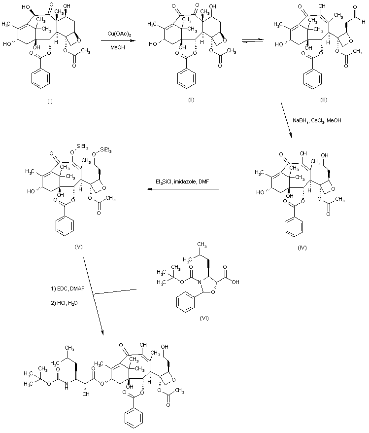 | 合成路线图解说明: Oxidation of 10-deacetylbaccatin III (I) by means of cupric acetate yielded diketone (II), in equilibrium with the retroaldol product (III). Subsequent reduction employing NaBH4 and CeCl3 produced the seco-taxane (IV) as the major reaction product. Selective protection of the 7 and 9 hydroxyl groups was achieved by treatment with chlorotriethylsilane and imidazole. The resultant 7,9-disilylated derivative (V) was then acylated by the oxazolidinecarboxylic acid (VI) to furnish, after acidic hydrolysis, the title C-seco taxane derivative. |