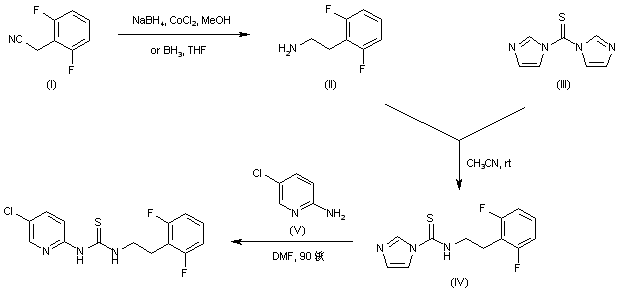 | 合成路线图解说明: 2,6-Difluorophenethylamine (II) was prepared by reduction of nitrile (I) with either NaBH4 in the presence of CoCl2 or borane in THF. Reaction of amine (II) with thiocarbonyldiimidazole (III) furnished the thioimidazolide (IV). This was finally condensed with 2-amino-5-chloropyridine (V), yielding the corresponding thiourea. |