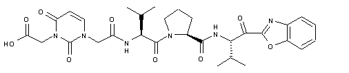 The reaction of pyrimidine-2,4(1H,3H)-dione (I) with benzyl 2-bromoacetate (II) by means of K2CO3 in DMF gives the pyrimidine-1-acetic acid benzyl ester (III), which is condensed with tert-butyl 2-bromoacetate (IV) by means of NaH in DMF to yield the pyrimidine bis acetate (V). Selective deprotection of the benzyl ester of (V) by means of H2 over Pd(OH)2 in ethyl acetate affords the mono acetic acid derivative (VI), which is condensed with the free amino group of the tripeptide analogue (VII) by means of EDC in pyridine to provide the acylated tripeptide analogue (VIII). The oxidation of the secondary OH group of (VIII) by means of DMP in dichloromethane furnishes the acylated 2-(L-valyl-L-prolyl-L-valyl)benzoxazole derivative (IX), which is finally deprotected with TFA in dichloromethane to give the target tripeptide analogue.
