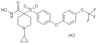 Ethyl nipecotate (I) was protected as the tert-butyl carbamate (II) upon treatment with Boc2O in THF. The lithium enolate of ester (II) was then sulfenylated with the disulfide (IV), prepared by oxidation of 4-fluorothiophenol (III), yielding thioether (V). This was further oxidized to the corresponding sulfone (VI) using meta-chloroperbenzoic acid. Acid cleavage of the Boc protecting group of (VI) gave piperidine (VII), which was converted to the N-cyclopropyl amine (IX) by reductive alkylation with [(1-ethoxycyclopropyl)oxy]trimethylsilane (VIII) in the presence of NaBH3CN. Displacement of the aryl fluoride of (IX) with 4-(trifluoromethoxy)phenol (X) under basic conditions afforded the diaryl ether (XI). After saponification of the ester group of (XI), the resultant carboxylic acid (XII) was coupled to O-(tetrahydropyranyl)hydroxylamine by means of EDC to produce the protected hydroxamate (XIII). Finally, removal of the tetrahydropyranyl protecting group of (XIII) with HCl in dioxan afforded the title compound.