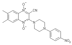 Acetylation of substituted aniline (I) with acetic anhydride in refluxing acetic acid affords acetanilide (II), which is then nitrated with HNO3:H2SO4 to provide 2-nitro derivative (III). Hydrolysis of (III) in concentrated H2SO4 gives substituted 2-nitroaniline (IV), which is then subjected to diazotization with NaNO2 and HCl in H2O and then treated with NaN3 and sodium acetate in H2O to furnish 2-nitrophenyl azide derivative (V). Cyclocondensation of azide (V) in refluxing toluene yields benzofuroxane (VI), which in turn is subjected to Beirut reaction with malonitrile (VII) in DMF in the presence of Et3N to yield 3-amino-2-quinoxalinecarbonitrile 1,4-di-N-oxide (VIII). The amino group of (VIII) is replaced by chlorine by using tert-butyl nitrite in acetonitrile in the presence of copper (II) chloride to give compound (IX). Finally, the target compound is obtained by reaction of (IX) with 1-(4-nitro-phenyl)piperazine (X) in dichloromethane or CHCl3 in the presence of Na2CO3 or K2CO3.