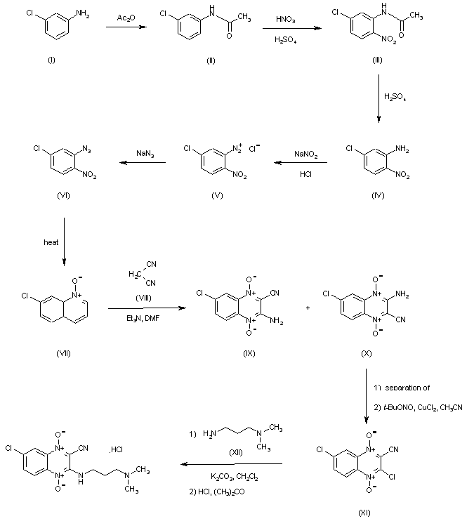 The acetylation of 3-chloroaniline (I) with refluxing acetic anhydride gives the corresponding anilide (II), which is nitrated with HNO3/H2SO4 yielding 5-chloro-2-nitroacetanilide (III). The hydrolysis of (III) with hot conc. H2SO4 affords 5-chloro-2-nitroaniline (IV), which is treated with NaNO2/HCl to afford the corresponding diazonium salt (V). The reaction of (V) with sodium azide gives 2-nitro-5-chlorophenylazide (VI), which is cyclized to 5-chlorobenzofurazan-3-oxide (VII) in refluxing toluene. The condensation of (VII) with malononitrile (VIII) in DMF in the presence of a catalytic amount of triethylamine afforded a mixture of the isomeric quinoxaline-di-N-oxides (IX and X), which were separated by flash chromatography. The 7-chloro isomer (XI) was then submitted to diazotization with tert-butyl nitrite in acetonitrile in the presence of cupric chloride, which effected a Sandmeyer reaction to give the 2,6-dichloro derivative (XI). N-Alkylation of 3-(N,N-dimethylamino)propylamine (XII) with intermediate (XI) in dichloromethane in the presence of potassium carbonate, followed by treatment with concentrated hydrochloric acid in acetone afforded the title compound.