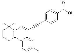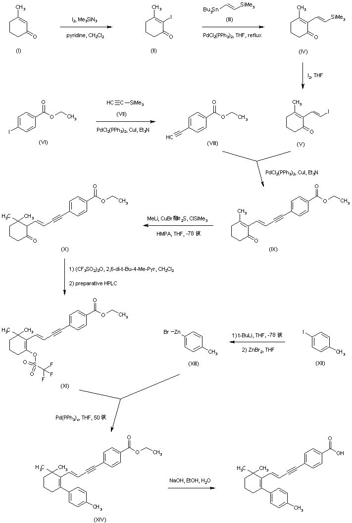 Iodination of 3-methylcyclohexenone (I) using iodine and azidotrimethylsilane produced the iodo ketone (II) (1). Palladium-catalyzed coupling of iodide (II) with 2-(tributylstannyl)ethenyltrimethylsilane (III), prepared from (trimethylsilyl)acetylene and tributyltin hydride, furnished the silylethenyl cyclohexenone (IV), which was further treated with iodine to yield vinyl iodide (V) (1,2). Ethyl 4-ethynylbenzoate (VIII) was prepared by reaction of ethyl 4-iodobenzoate (VI) with (trimethylsilyl)acetylene (VII) in the presence of palladium catalyst (1). Heck reaction between acetylene (VIII) and vinyl iodide (V) provided adduct (IX). Conjugate addition of the in situ generated lithium dimethylcuprate to the unsaturated ketone (IX) gave the 3,3-dimethyl cyclohexanone (X). Treatment of (X) with triflic anhydride and a hindered base produced the desired vinyl triflate (XI) along with its vinyl regioisomer, which were separated by preparative chromatography. Reaction of triflate (XI) with 4-tolylzinc bromide (XIII), prepared from 4-iodotoluene (XII), yielded the phenylcyclohexene derivative (XIV). The ethyl ester group of (XIV) was finally hydrolyzed to the corresponding carboxylic acid using NaOH.