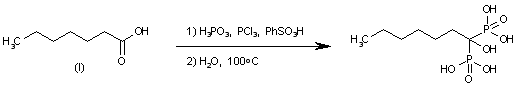 The reaction of heptanoic acid (I) with H3PO3, PCl3 and benzenesulfonic acid at 65 C, followed by a treatment in refluxing water gives the target diphosphonic acid.