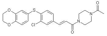 Aromatic nucleophilic substitution of 3-chloro-4-fluorobenzaldehyde (I) with methyl 3-mercaptopropionate (II) yielded the mercapto aldehyde (III). This was subjected to Knoevenagel condensation with malonic acid to furnish the cinnamic acid derivative (IV), which was further converted to the corresponding acid chloride (V) by using oxalyl chloride. Condensation of acid chloride (V) with N-acetylpiperazine (VI) yielded the diacyl piperazine (VII). The protected benzenethiol of (VII) was released by treatment of the beta-mercaptopropionate (VII) with potassium tert-butoxide to give the potassium thiolate (VIII). Finally, Ullmann coupling of (VIII) with 6-iodobenzodioxan (IX) furnished the title compound.