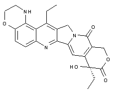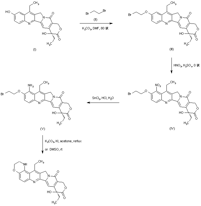 Alkylation of 7-ethyl-10-hydroxycamptothecin (I) with 1,2-dibromoethane (II) under Williamson's ether synthesis conditions furnished the bromoethyl ether (III). Subsequent regioselective nitration of (III) provided the desired 9-nitro compound (IV), which was further reduced to the corresponding amine (V) by using SnCl2 in concentrated HCl. Finally, cyclization of the bromo amine (V) to give the title hexacyclic compound was carried out either in the presence of KI and K2CO3 in refluxing acetone or on standing in a DMSO solution at room temperature.