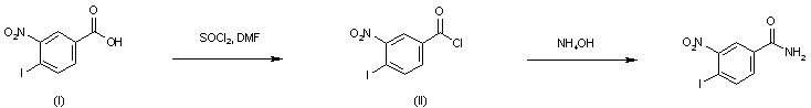 The title benzamide derivative was prepared from 4-iodo-3-nitrobenzoic acid (I), by activation as the corresponding acid chloride (II) with SOCl2 in DMF, followed by quenching with concentrated ammonium hydroxide.
