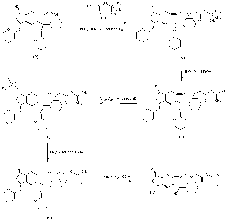 Alkylation of the allylic alcohol (IX) with tert-butyl bromoacetate (X) under phase-transfer conditions afforded ester (XI), which was then subjected to titanium isopropoxide-mediated transesterification to the corresponding isopropyl ester (XII). Conversion of secondary alcohol (XII) into chloride (XIV) was performed via the mesylate (XIII), which was then treated with tetrabutylammonium chloride in hot toluene. Finally, acidic cleavage of the tetrahydropyranyl ether groups of (XIV) led to the title compound.