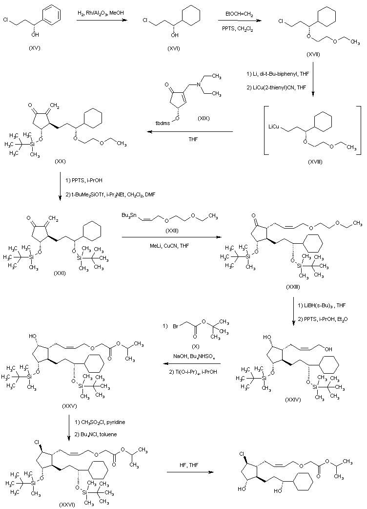 In a different route, hydrogenation of (R)-3-chloro-1-phenyl-1-propanol (XV) over Rh/Al2O3 gave the cyclohexyl carbinol (XVI), which was protected as the ethoxyethyl ether (XVII) by treatment with ethyl vinyl ether in the presence of pyridinium tosylate. Lithiation of chloride (XVII), followed by exchange with lithium (2-thienyl)cyanocuprate, generated the organocuprate reagent (XVIII), which produced a conjugate addition to enone (XIX) to afford the methylene ketone (XX). Protecting group exchange in (XX) was effected by acidic cleavage of the ethoxyethyl group, followed by silylation with t-butyldimethylsilyl triflate, yielding the bis-silylated compound (XXI). The Z-vinylstannane reagent (XXII) was subjected to a stereospecific transmetalation with Me2Cu(CN)Li2 and the resulting cuprate underwent conjugate addition to enone (XXI) yielding adduct (XXIII). Reduction of ketone (XXIII) with L-Selectride? followed by acidic cleavage of the ethoxyethyl group, provided diol (XXIV). Alkylation of (XXIV) with tert-butyl bromoacetate (X), followed by transterification as above, furnished the isopropyl ester (XXV). The remaining hydroxyl group of (XXV) was subsequently exchanged by a chloride (XXVI) via the corresponding mesylate. Finally, desilylation of (XXVI) with HF in THF gave rise to the title compound.