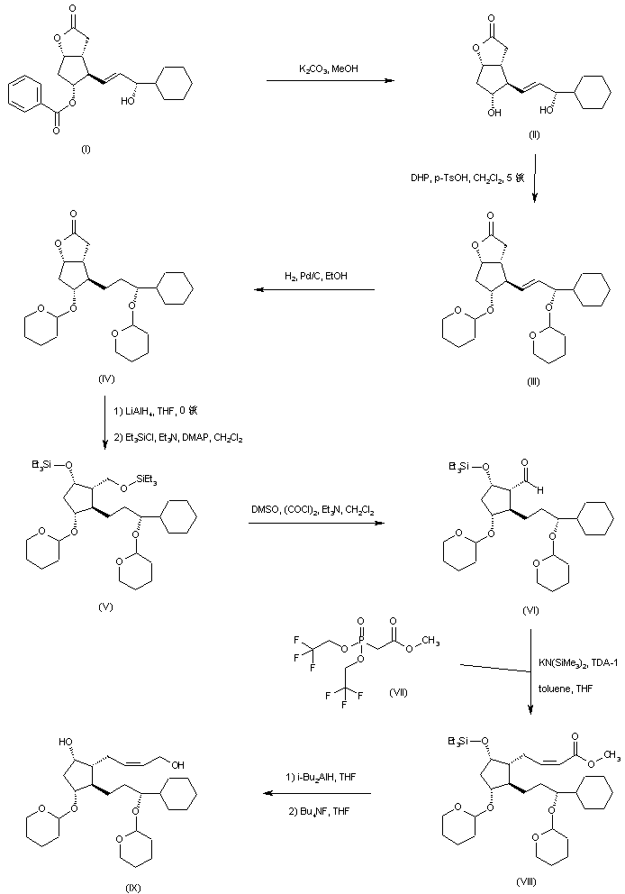 The benzoate ester group of the known lactone precursor (I) was removed by methanolysis in the presence of K2CO3 to afford diol (II), which was further protected as the bis-tetrahydropyranyl ether (III). Catalytic hydrogenation of (III) provided the 13,14-dihydro compound (IV). The lactone function of (IV) was then reduced with LiAlH4 to the corresponding open chain diol, which was subsequently protected as the bis-silyl derivative (V). Regioselective Swern oxidation of the silylated primary hydroxyl of (V) furnished aldehyde (VI). This was subjected to Wadsworth-Emmons olefination with phosphonate (VII) in the presence of tris[2-(2-methoxyethoxy)ethyl]amine (TDA-1) as the K+-complexing agent to yield the Z-unsaturated ester (VIII) as the major isomer. Ester group reduction in (VIII) by means of DIBAL, followed by desilylation with tetrabutylammonium fluoride, provided the allylic alcohol (IX).