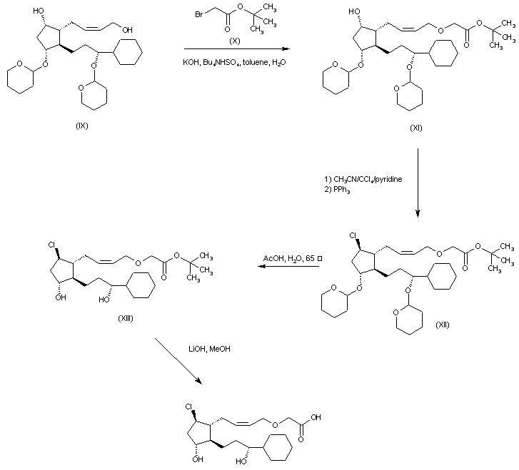 Alkylation of the allylic alcohol (IX) with tert-butyl bromoacetate (X) under phase-transfer conditions afforded ester (XI), which was then converted into chloro derivative (XII) by treatment with a mixture of CH3CN/CCl4/pyridine and then PPh3. Acidic cleavage of the tetrahydropyranyl ether groups of (XII) led to the dihydroxy derivative (XIII), which was finally subjected to saponification with LiOH in MeOH to yield the desired product.