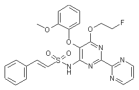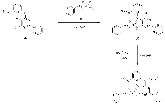 Nucleophilic substitution of the dichloropyrimidine derivative (I) with 2-phenylvinylsulfonamide (II) in the presence of NaH in DMF affords the sulfonamido pyrimidine (III). The remaining chloro group of (III) is subsequently displaced with the sodium alkoxide derived from 2-fluoroethanol (IV) to provide the target fluoroethyl ether.