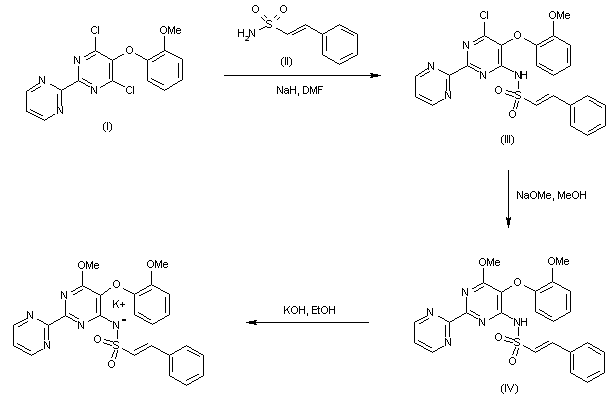 The known dichloropyrimidine derivative (I) was condensed with 2-phenylethenesulfonamide (II) in the presence of NaH in DMF to furnish the N-pyrimidinylsulfonamide (III). Displacement of the remaining chlorine of (III) by means of methanolic NaOMe provided the corresponding methyl ether (IV). The title potassium salt was then prepared by treatment of sulfonamide (IV) with ethanolic KOH.