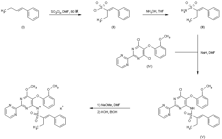 The sulfonation of 1-phenyl-1-butene (I) with sulfuryl chloride in hot DMF provided sulfonyl chloride (II), which was then treated with ammonium hydroxyde to give sulfonamide (III). Coupling of the known dichloro bipyrimidinyl derivative (IV) with the sodium salt of sulfonamide (III) yielded the N-pyrimidinyl sulfonamide (V). The remaining chloride was then displaced with sodium methoxide in DMF, and the resultant sulfonamide was finally converted to the potassium salt with ethanolic KOH.