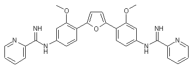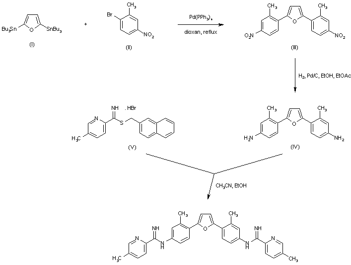 Stille coupling between 2,5-bis(tri-n-butylstannyl)furan (I) and 2-bromo-5-nitroanisole (II) produced the 2,5-bis(4-nitrophenyl)furan (III), which was further reduced to the diamino derivative (IV) by catalytic hydrogenation over Pd/C. The title diamidine was then obtained by reaction of diamine (IV) with the S-(2-naphthylmethyl)thioimidate (V).