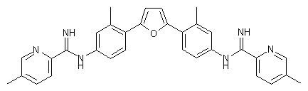 Stille coupling between 2,5-bis(tri-n-butylstannyl)furan (I) and 2-bromo-5-nitroanisole (II) produced the 2,5-bis(4-nitrophenyl)furan (III), which was further reduced to the diamino derivative (IV) by catalytic hydrogenation over Pd/C. The title diamidine was then obtained by reaction of diamine (IV) with the S-(2-naphthylmethyl)thioimidate (V).