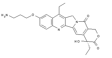 The title compound was prepared from aminopropiophenone (XXVII) by several procedures. Aldol condensation of (XXVII) with the intermediate pyranoindolizinetrione (XVII) with concomitant Friedlander quinoline synthesis under acidic conditions furnished the camptothecin derivative (XXVIII). Optionally, (XXVIII) was also obtained by condensation of (XXVII) with intermediate ketone (XIX), followed by basic hydrolysis of the resultant lactone-ester (XXIX) and subsequent relactonization under acidic conditions. Finally, acid cleavage of the N-Boc group of (XXVII) yielded the title compound.