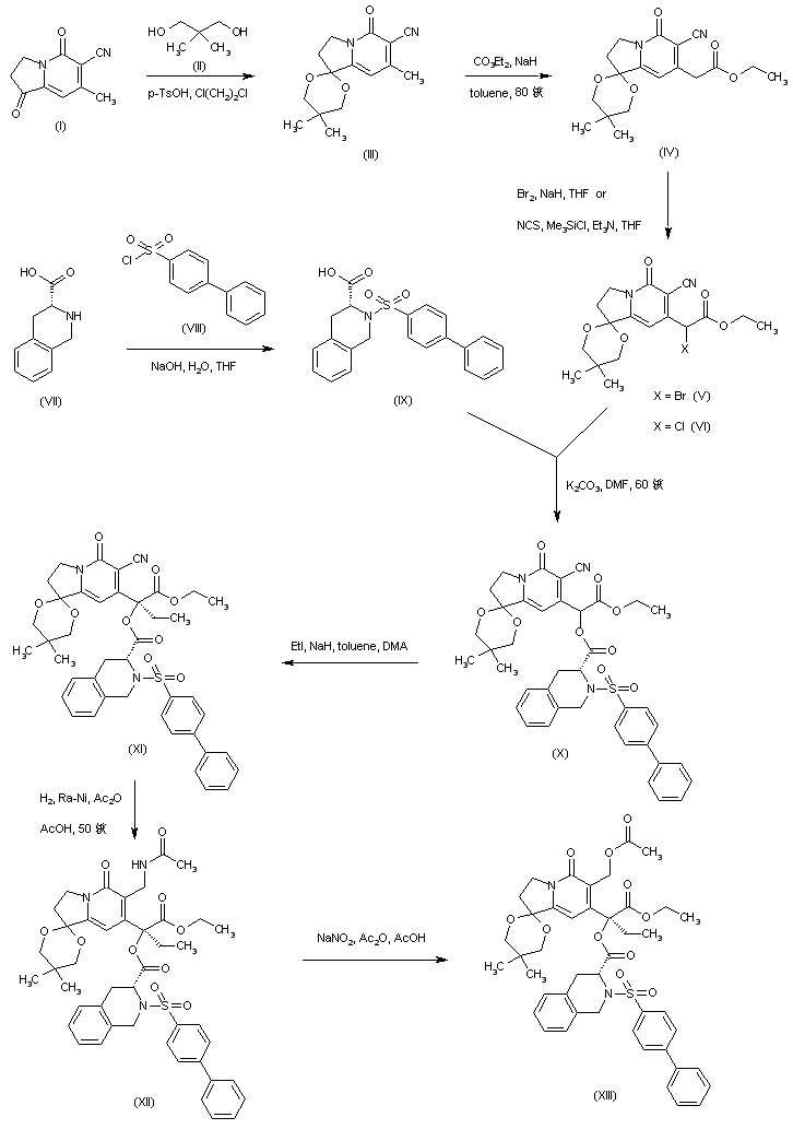 Indolizinone (I) was converted to the cyclic ketal (III) upon treatment with 2,2-dimethyl-1,3-propanediol (II) in the presence of p-toluenesulfonic acid. Carbethoxylation of (III) with diethyl carbonate and NaH afforded ester (IV), which was halogenated with either bromine or N-chlorosuccinimide to produce the corresponding alpha-bromo (V) or alpha-chloro (VI) ester, respectively. Sulfonylation of (R)-1,2,3,4-tetrahydroisoquinoline-3-carboxylic acid (VII) with 4-biphenylylsulfonyl chloride (VIII) provided the chiral auxiliary (IX). This was then condensed with halo ester (V) or (VI) in the presence of K2CO3 to furnish adduct (X). Diastereoselective alkylation of the sodium enolate of (X) with ethyl iodide produced (XI) as the major isomer. The cyano group of (XI) was then converted to acetamide (XII) by catalytic hydrogenation over Raney nickel in the presence of Ac2O and HOAc. Subsequent nitrosation of amide (XII) with NaNO2 in Ac2O/HOAc gave acetate ester (XIII).