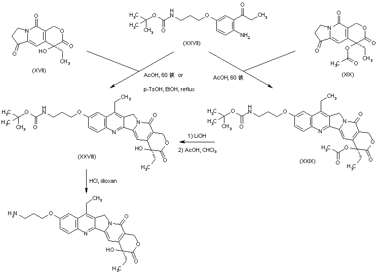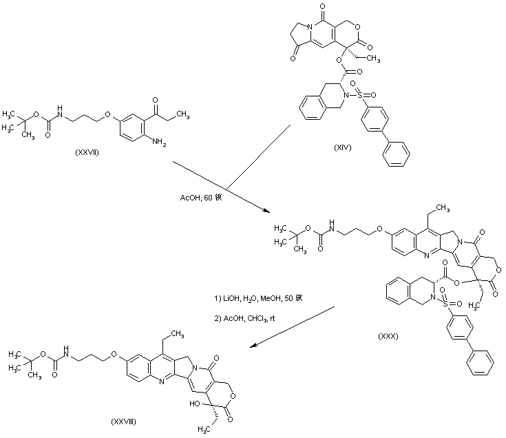 In an alternative procedure, condensation of aminopropiophenone (XXVII) with the intermediate pyranoindolizinetrione (XIV) under acidic conditions gave rise to camptothecin derivative (XXX). Basic hydrolysis of the chiral auxiliary ester and lactone groups of (XXX) followed by acidic relactonization then gave the precursor (XXVIII), which was finally subjected to Boc group cleavage as indicated above.