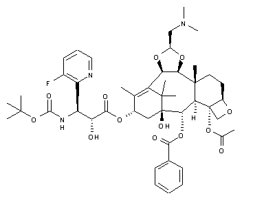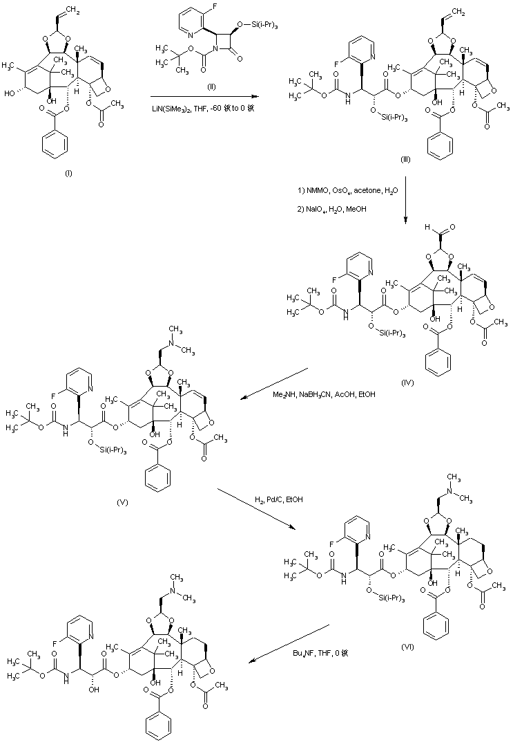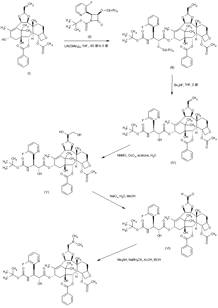 The title taxane derivative is prepared by two related ways. Taxane (I) is condensed with azetidinone (II) in the presence of lithium hexamethyldisilazide to afford ester (III). The triisopropylsilyl protecting group of (III) is then removed by using a solution of tetrabutylammonium fluoride in THF, yielding (IV). Dihydroxylation of the vinyl group of (IV) with N-methylmorpholine N-oxide in the presence of osmium tetroxide produces diol (V), which is subsequently cleaved to aldehyde (VI) by means of NaIO4. Finally, reductive amination of aldehyde (VI) with dimethylamine and NaBH3CN gives rise to the target amine.