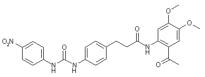 Acylation of 2-amino-4,5-dimethoxyacetophenone (I) with 4-nitrocinnamoyl chloride (II) affords amide (III). Simultaneous double bond hydrogenation and nitro group reduction in (III) with hydrogen and Pd/C leads to aniline (IV). This is finally condensed with 4-nitrophenyl isocyanate (V) in the presence of DMAP to produce the corresponding urea