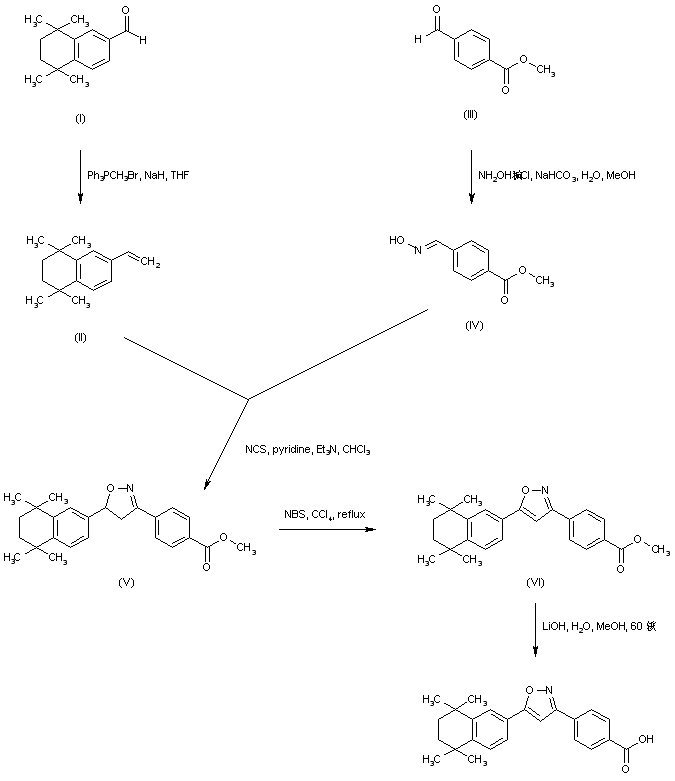 Wittig reaction of aldehyde (I) with methylene triphenylphosphorane produced olefin (II). Oxime (IV) was prepared from methyl 4-formylbenzoate (III) by treatment with hydroxylamine. The nitrile oxide generated from imine (IV) by chlorination, followed by elimination under basic conditions, underwent a [3+2] regioselective cycloaddition with alkene (II) to produce isoxazoline (V). Oxidation of the isoxazoline ring of (V) to the corresponding isoxazole derivative (VI) was accomplished by treatment with N-bromosuccinimide. Finally, ester hydrolysis with LiOH furnished the title carboxylic acid.