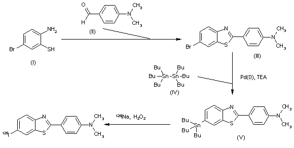 The cyclization of 4-bromo-2-sulfanylaniline (I) with 4-(dimethylamino)benzaldehyde (II) by heating at 180 C in DMSO gives 6-bromo-2-[4-(dimethylamino)phenyl]benzothiazole (III), which is treated with (Bu3Sn)2 (IV) and Pd(PPh3)4 and TEA in dioxane to yield the tributyltin derivative (V). Finally, this compound is treated with 125INa and H2O2 in ethanol/water to afford the target radiolabeled compound.