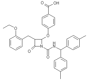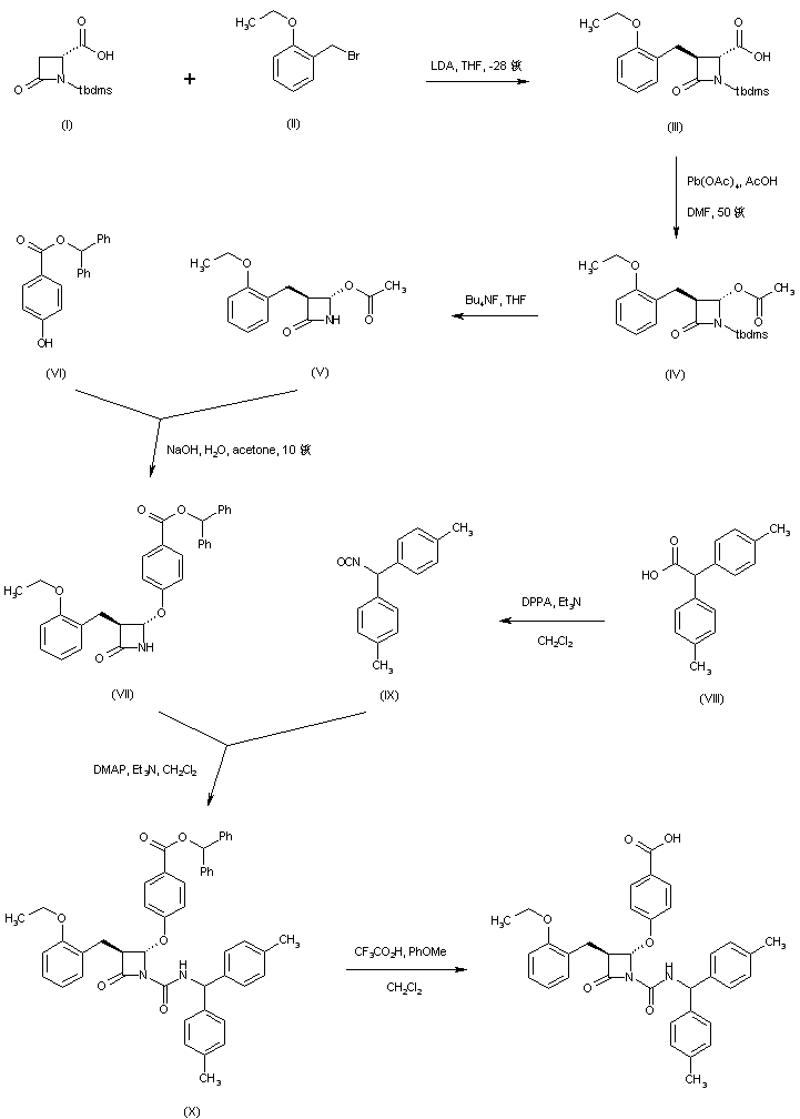 Alkylation of the dianion of azetidinonecarboxylic acid (I) with 2-ethoxybenzyl bromide (II) in cold THF affords (III). Oxidative cleavage of the carboxyl group of (III) using lead tetraacetate and HOAc provides the acetate ester (IV), which is desilylated to (V) with tetrabutylammonium fluoride in THF. Azetidinone (V) is coupled with benzhydryl 4-hydroxybenzoate (VI) to yield ether (VII). Curtius rearrangement of carboxylic acid (VIII) provides isocyanate (IX). Coupling between isocyanate (IX) and azetidine (VII) gives rise to urea (X). The benzhydryl ester group of (X) is finally cleaved by treatment with trifluoroacetic acid in the presence of anisole.