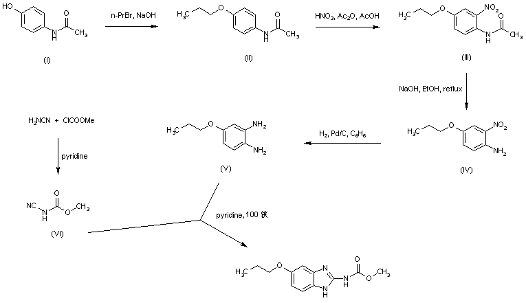 Alkylation of 4-hydroxyacetanilide (I) with n-propyl bromide provided 4-propoxyacetanilide (II). Aromatic nitration of (II) with fuming nitric acid in the presence of acetic anhydride afforded the nitro acetanilide (III), which was further hydrolyzed to the nitro aniline (IV) under basic conditions. Subsequent catalytic hydrogenation of the nitro group of (IV) furnished the phenylenediamine (V). Cyanocarbamate (VI), generated from cyanamide and methyl chloroformate, was then condensed with 4-propoxy-1,2-phenylenediamine (V) in hot pyridine to provide the title benzimidazolyl carbamate.