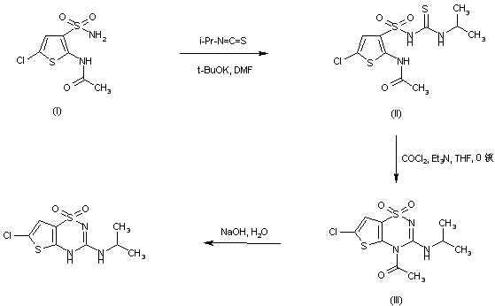 The thiocarbamoylation of the thiophenesulfonamide (I) with isopropyl isothiocyanate in the presence of potassium tert-butoxide furnished the sulfonyl thiourea (II). This was cyclized to the thienothiadiazine derivative (III) upon treatment with phosgene and triethylamine in cold THF. The acetyl group of (III) was finally removed by hydrolysis with NaOH.