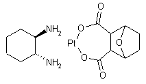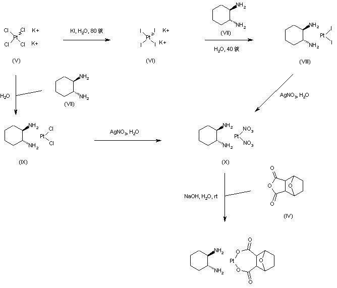 The platinum nitrate derivative (X) was prepared by two related procedures. Halogen-exchange of potassium tetrachloroplatinate (V) with KI produced the tetraiodoplatinate (VI), which was subsequently reacted with trans-1,2-diaminocyclohexane (VII) to give the diamino chelate (VIII). Alternatively, diamine (VII) was reacted with tetrachloroplatinate (V), yielding chelate (IX). Treatment of either iodo compound (VIII) or its analogous chloride (IX) with silver nitrate furnished the dinitrate compound (X). Finally, the diacid formed by basic hydrolysis of anhydride (IV) was in situ complexed with the platinum compound (X) to generate the title platinum complex.