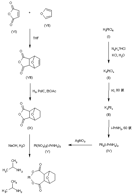 Hexachloroplatinic acid (I) was reduced to potassium tetrachloroplatinate (II) using hydrazine. Treatment of (II) with KI produced the tetraiodoplatinate (III), which was converted to the diamino compound (IV) by reaction with isopropylamine. Conversion to the dinitrate (V) was then effected by iodide ion exchange with silver nitrate. Diels-Alder condensation of maleic anhydride (VI) with furan (VII) furnished adduct (VIII), which was further hydrogenated to (IX) using Pd/C. Then, basic hydrolysis of the cyclic anhydride in the presence of the platinum complex (V) afforded the title compound.