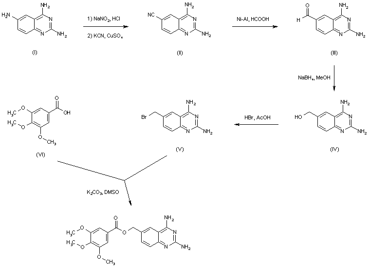 Nitrile (II) was prepared by regioselective diazotization of triaminoquinazoline (I), followed by treatment with KCN and CuSO4. Conversion of nitrile (II) into aldehyde (III) was achieved by means of Ni-Al alloy in refluxing formic acid. Subsequent reduction of aldehyde (III) with NaBH4 gave alcohol (IV), which was further brominated to (V) using HBr in HOAc. Finally, displacement of the bromide of (V) with 3,4,5-trimethoxybenzoic acid (VI) provided the target trimethoxybenzoate ester.