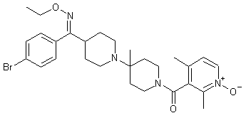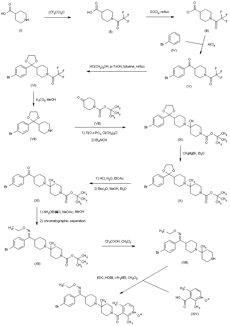 Protection of isonipecotic acid (I) as the trifluoroacetamide (II), followed by treatment with thionyl chloride, afforded acid chloride (III). Friedel-Crafts reaction of acid chloride (III) with bromobenzene (IV) gave ketone (V), which was further protected as the ethylene ketal (VI). The trifluoroacetamide group of (VI) was then hydrolyzed to amine (VII) using K2CO3 in MeOH. Condensation of amine (VII) with N-Boc-4-piperidone (VIII) in the presence of titanium isopropoxide, and subsequent addition of diethylaluminum cyanide to the intermediate iminium salt, provided amino nitrile (IX). Treatment of (IX) with methylmagnesium bromide afforded the methyl derivative (X). Acid hydrolysis of the ketal and Boc groups of (X), followed by reprotection with Boc2O, furnished ketone (XI). Oxime formation in (XI) with O-ethyl hydroxylamine produced a 1.5:1 mixture of (E)- and (Z)-isomers, which were separated by silica gel chromatography. Previous equilibration of the mixture under acidic conditions favored the desired (Z)-isomer (XII). The Boc protecting group of (XII) was then removed by treatment with trifluoroacetic acid. The resultant piperidine (XIII) was finally coupled with 2,4-dimethylnicotinic acid N-oxide (XIV) using EDC and HOBt to furnish the title compound.