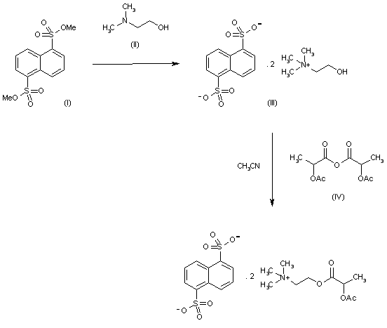 The reaction of dimethyl naphthalene-1,5-disulfonate (I) with dimethylaminoethanol (II) gives bis (2-hydroxyethyltrimethylammonium)naphthalene-1,5-disulfonate (III), which is then condensed with 2-acetoxypropionic anhydride (IV) in refluxing acetonitrile