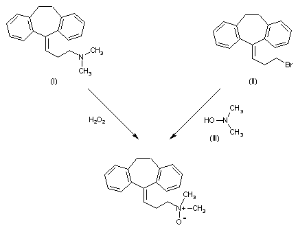 It can be prepared in two different ways: 1) By oxidation of 3-(3-dimethylaminopropylidene)dibenzo[a,d]cyclohepta-1,4-diene (I) with H2O2 in methanol (1-5). 2) By reaction of 3-(3-bromopropylidene)dibenzo[a,d]cyclohepta-1,4-diene (II) with dimethylhydroxylamine (III) by means of K2CO3 in refluxing acetone (1-3).