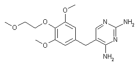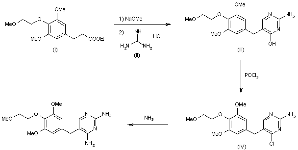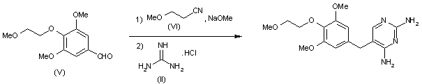 2) Using 3,5-dimethoxy-4-(2-methoxyethoxy)benzaldehyde (V) as a starting material, Tetroprim can be obtained by reaction with 3-methoxypropionitrile (VI) in the presence of a basic catalyst and ring closure finally brought about with guanidine hydrochloride (II).