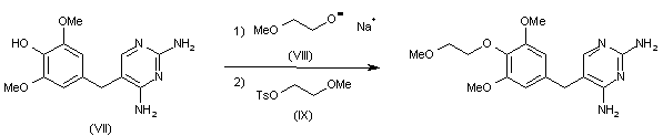 3) 2,4-Diamino-5-(3,5-dimethoxy-4-hydroxybenzyl)pyrimidine (VII) can be etherised after heating under reflux for three hours with p-toluenesulfonic acid-(2-methoxyethyl)ester (IX) in the presence of a basic catalyst.
