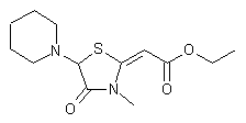 The cyclization of a mixture of ethyl mercaptoacetate (I) and ethyl cyanacetate (II) by means of sodium ethoxide in ethanol gives ethyl 4-oxo-2-thiazolidinylideneacetate (III), which is methylated with sodium methoxide and methyl iodide yielding the N-methyl analog (IV). Bromination of (IV) with Br2 in chloroform affords the 5-bromo derivative (V), which is finally treated with piperidine (VI) in benzene.