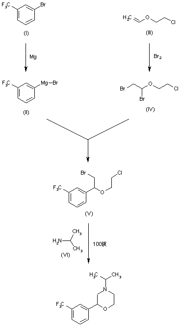The reaction of 2-chloroethyl vinyl ether (III) with bromine gives 1,2-dibromo-2-[(2-chloro)ethoxy]ethane (IV) which reacts with the magnesian derivative (II) [obtained from (3-trifluoromethyl)bromobenzene (I) and magnesium in anhydrous ether] to give 2-[(3-trifluoromethyl)phenyl]-2-[(2-chloro)ethoxy]-1-bromoethane (V). The compound (V) is heated in an autoclave at 100 C with isopropylamine (VI) in toluene.