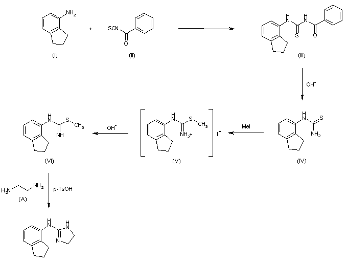 4-Amiomoindan (I) is reacted with benzoylisothiocyanate (II) to give the benzoylthiourea (III), which after hydrolysis of 4-indanyltiourea (IV) is methylated with iodomethane to (V). The free base (VI) is cyclized with ethyldiamine (A) and p-toluenesulfonic acid to indanazoline