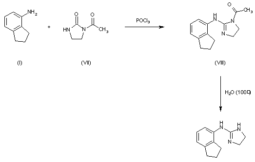 By reacting 1-acetyl-2-imidazolidinone (VII) with 4-aminoindan (I) and POCl3 at 50 C 1-acetylindanazolidine (VIII) is synthesized, which gives indanazoline by hydrolysis