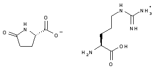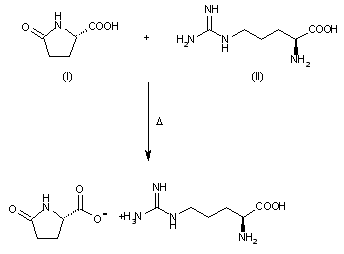 By vacuum evaporation of a refluxed solution of pyroglutamic acid (II) and arginine (I).