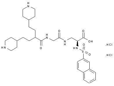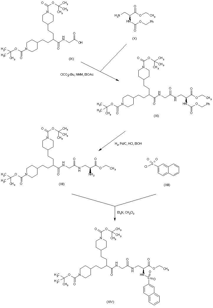 | 合成路线图解说明: After activation of acid (IX) as the mixed anhydride with isobutyl chloroformate, coupling with the mono-protected diaminopropionate (X) leads to amide (XI). Subsequent removal of the N-carbobenzoxy group by catalytic hydrogenolysis gives amino ester (XII). This is then acylated by 2-naphthalenesulfonyl chloride (XIII), yielding sulfonamide (XIV). |