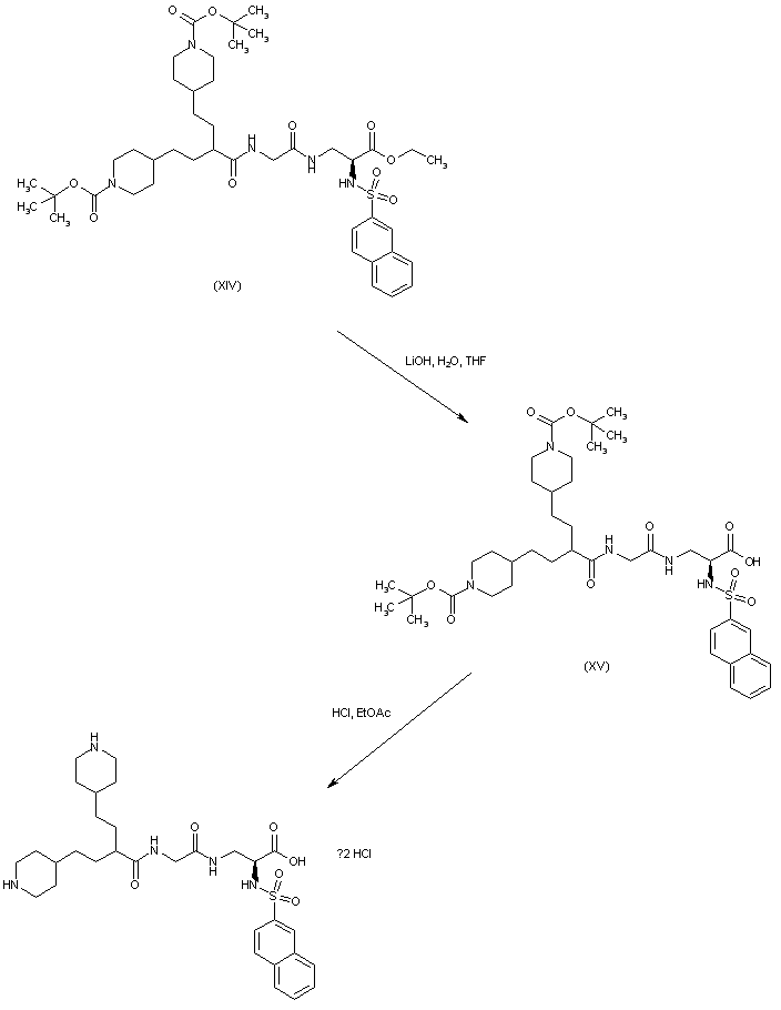 | 合成路线图解说明: Hydrolysis of ethyl ester (XIV) employing LiOH affords the carboxylic acid (XV). The N-Boc protecting groups are finally removed by treatment with HCl in EtOAc to provide the title compound. |