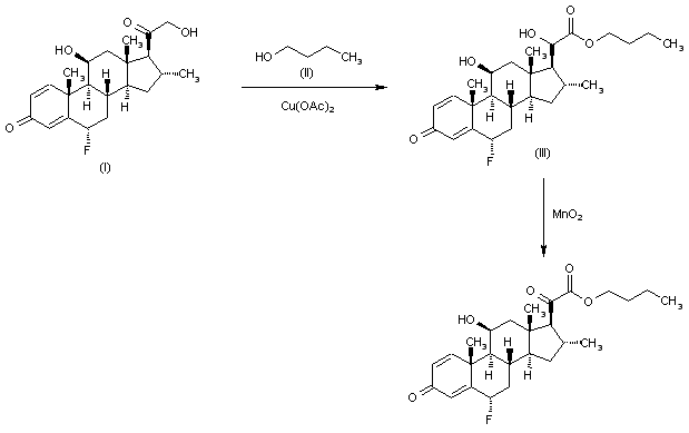 The reaction of 6alpha-fluoro-11beta,21-dihydroxy-16alpha-methylpregna-1,4-diene-3,20-dione (I) with cupric acetate and n-butanol (II) gives compound (III), which is the oxidized with MnO2 in refluxing methylene chloride.