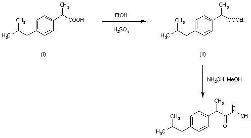 By esterification of 2-(p-isobutylphenyl)propionic acid (I) with ethanol and H2SO4 at reflux temperature yielding the corresponding ethyl ester (II), which is the treated with hydroxylamine in refluxing methanol