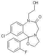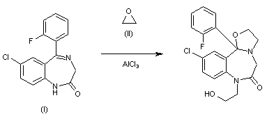 By reaction of 7-chloro-5-(2-fluorophenyl)-1,3-dihydro-2H-1,4-benzodiazepin-2-one (I) with ethylene oxide (II) by means of AlCl3 in benzene