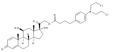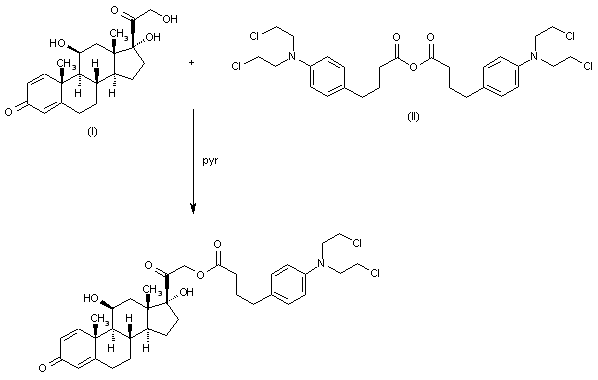 By condensation of prednisole (I) with 4-[p-(bis-(2-chloroethyl)amino)phenyl]butyric anhydride (II) in pyridine.
